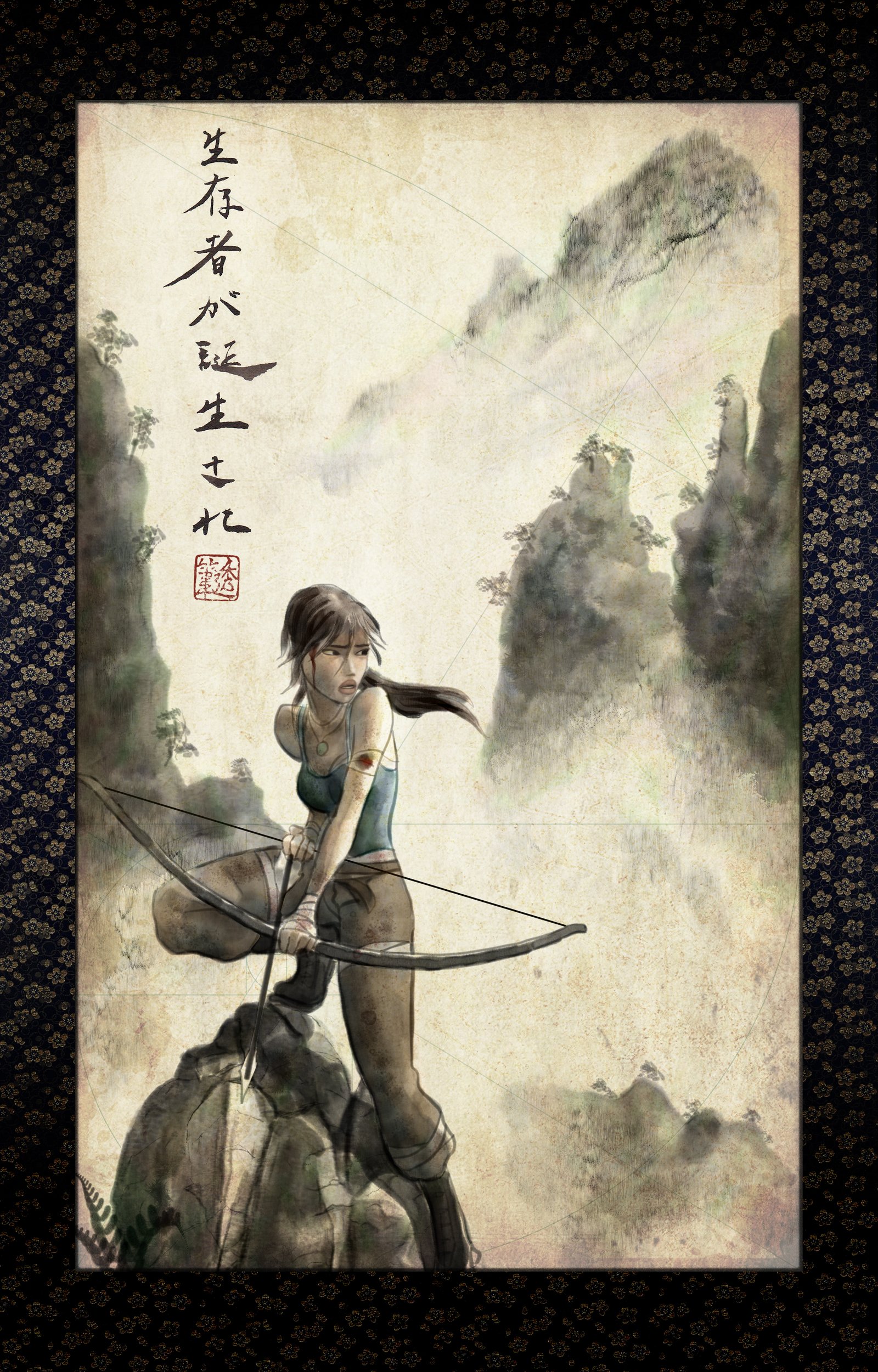 “Acho que a peça chave sobre a nova Lara que a Crystal está criando é o sobre o quanto mais humana ela é. Eu queria capturar o medo e a vulnerabilidade, mas de modo que demonstre sua habilidade de superar suas dificuldades internas e externas. Eu sou péssimo em arcos, e eu queria representa-la como uma figura quase mítica, como algum Ronin ferido contra um mundo difícil, porém belo. Eu sou um designer de jogos e animador, que faz um pouco de arte por fora, então eu sabia que não poderia superar os artistas que foram antes de mim, tentando criar uma imagem realística. Eu escolhi uma mídia natural e usei o Painter 12 para imitar uma tinta lavável/aquarela com muita textura e pouco detalhe."