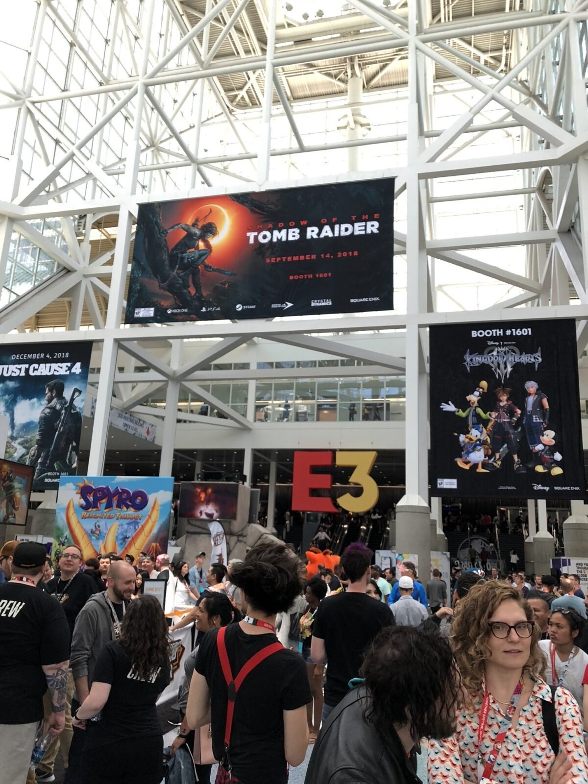 Chegando na E3 a primeira coisa que você precisa fazer é emitir sua credencial. Haviam longas filas e tivemos alguns problemas com a impressão. Depois de conversar com algumas pessoas, conseguimos enfim emiti-las e restava só aguardar a abertura dos portões. Como em 2018 o evento foi aberto a todo o público, as filas para a entrada estavam enormes. Por sorte, por sermos embaixadores oficiais, conseguimos passar na frente graças à Morrigan Johnen, uma das Gerentes de Comunidade da Crystal Dynamics, uma pessoa com uma energia e um fôlego surreal. Portões abertos e hora de entrar. Nossa entrada ocorreu pelo South Hall, local onde estava a área reservada à Square Enix.