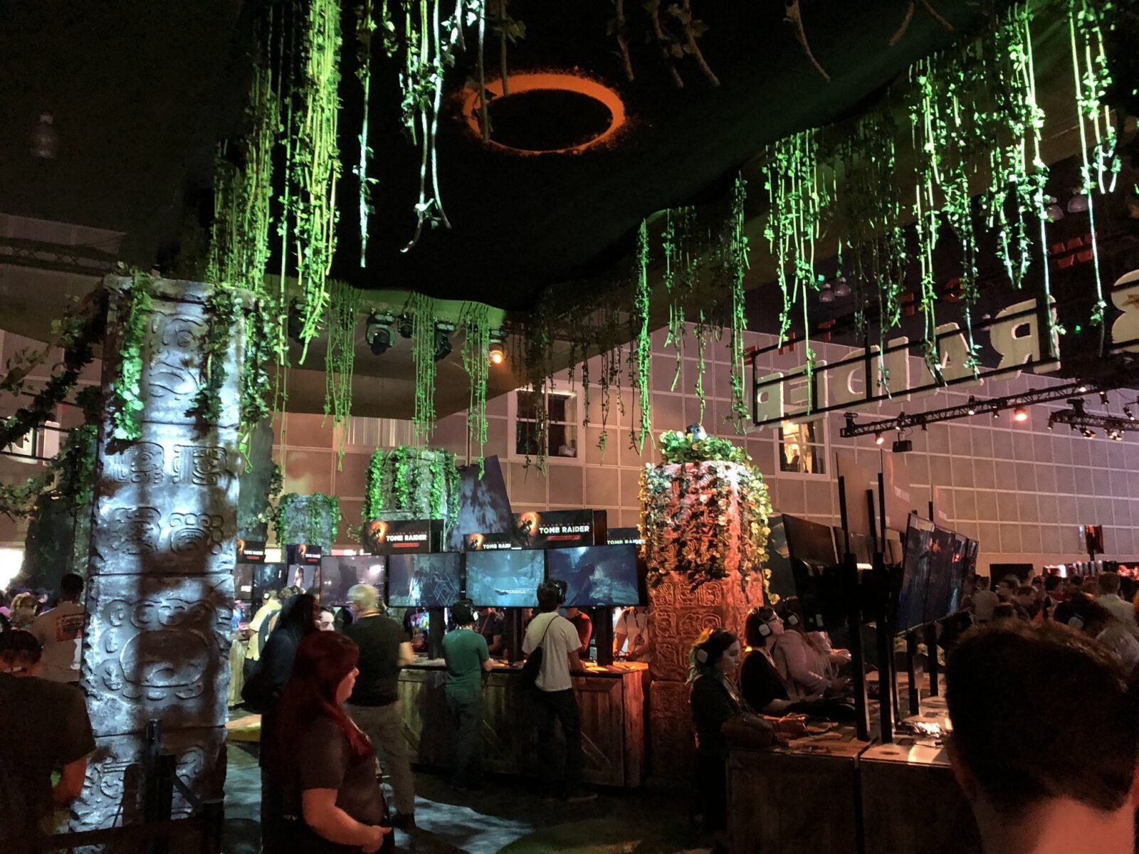 Vale destacar que Shadow of the Tomb Raider era o primeiro stand da feira. Um local relativamente grande, com muita vegetação e colunas com hieróglifos maias. A área era dividida em três partes: uma área com estações para o público geral testar o jogo, onde as filas eram enormes, uma área com estações reservadas aos veículos de mídia (Media Priority) e uma sala fechada onde os produtores exibiam outras demonstrações em portas fechadas. Dentro do stand havia um local onde eram exibidas réplicas do arco utilizado no jogo e também dos machados. Já na parte de fora os fãs tinham a oportunidade de tirar foto com os cosplayers oficiais: Jenn Croft, Raymond Croft e Miranda Turner.