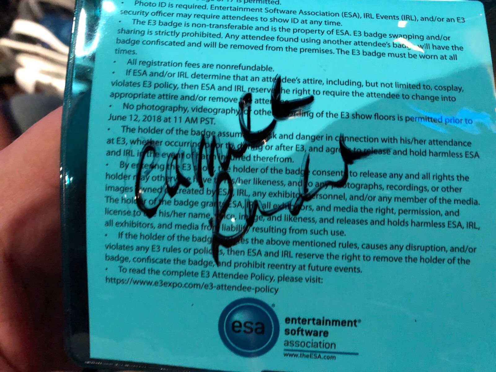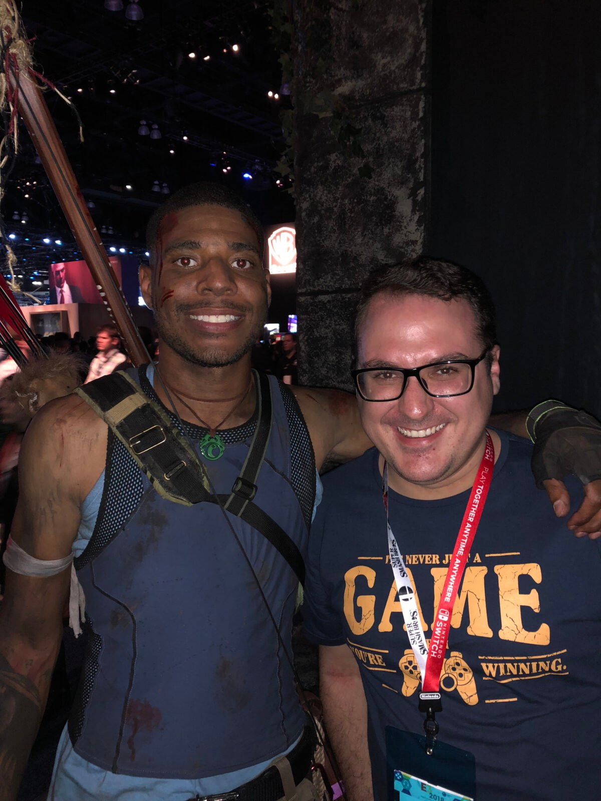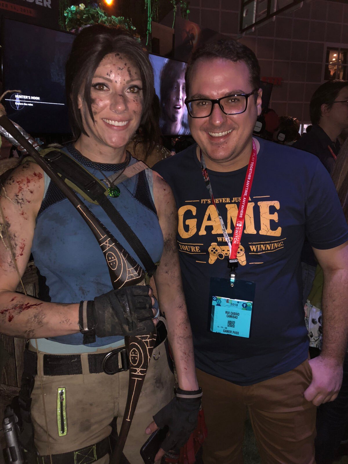Terminando a nossa hora curtindo o jogo seguimos para o local onde é gravado o Square Enix Presents. Já estavam no local aguardando: Meagan Marie, Earl Baylon e Camilla Luddington. Foi incrível vê-los de perto pela primeira vez. O local era cercado por um vidro e somente era possível ouvir o que estava acontecendo lá dentro assistindo a transmissão ao vivo. Infelizmente havia um grande delay e optei por não ouvir nada. Depois de terminada a transmissão, seguimos até o outro lado do stand da Square Enix, onde ficava Just Cause 4, e encontramos Camilla e Earl pessoalmente. O público que passava pelo local parecia estar um pouco incomodado, pois era um corredor relativamente estreito e a quantidade de fãs de Tomb Raider era um pouco grande. Mas quem liga, não é mesmo? Tive a oportunidade de ter minha credencial da E3 autografada pela Camilla e de tirar uma foto com ela e o Earl.