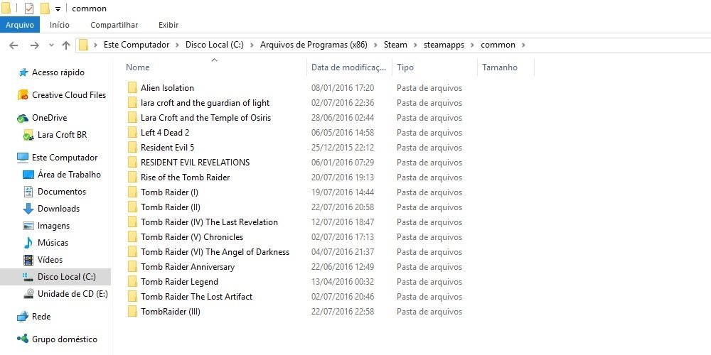 - No desktop contém agora uma pasta para cada jogo. Abra-as e copie os arquivos de dentro de cada uma delas para as respectivas pastas onde os jogos estão instalados e substitua-os quando for solicitado. No caso da versão Steam, elas ficam em: C:\Arquivos de Programas (x86)\Steam\steamapps\common. Porém, NÃO COPIE os arquivos do TR4 e TR5. Substitua apenas os do TR2, 3 e Lost Artifact.