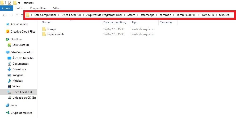- Se você quiser utilizar as texturas em HD das versões de iOS/Android, baixe-as clicando aqui e extraia o arquivo. Abra o conteúdo extraído e copie as pastas dumps e replacements para dentro da pasta textures, que está dentro de Tomb2Fix, no diretório onde o jogo está instalado.