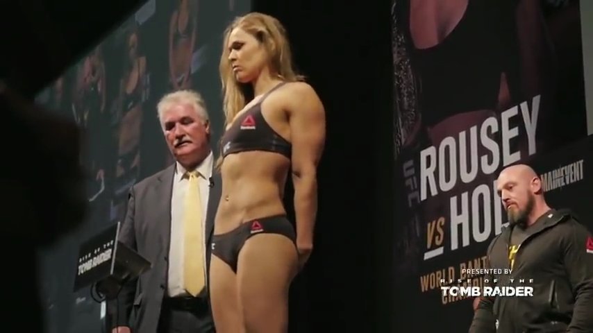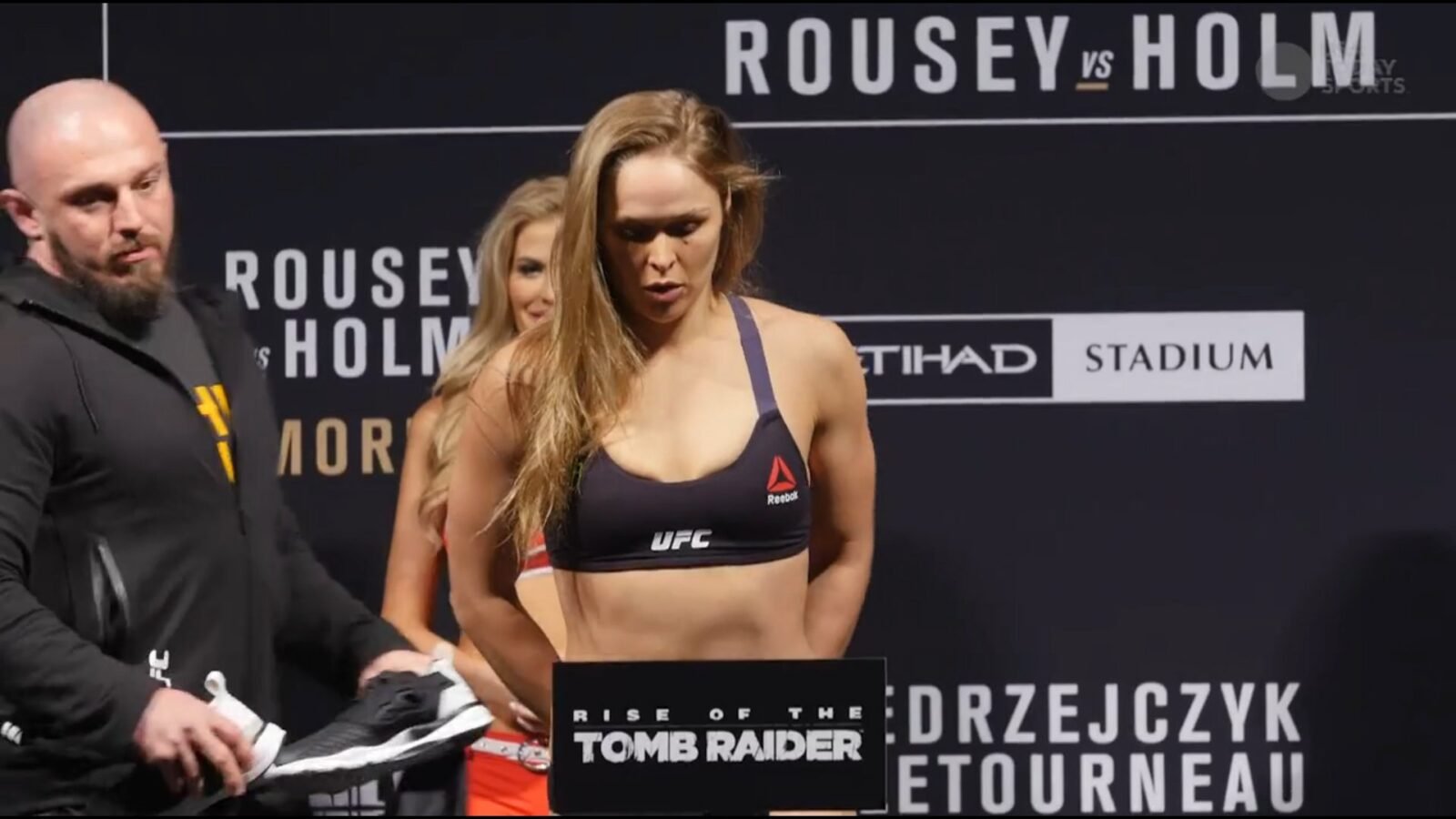 O logotipo de Rise of the Tomb Raider ganha destaque também ao ser visto na placa onde é feita a pesagem dos lutadores (onde geralmente é escrito “UFC”), onde ocorreu a pesagem de Holly Holm, Ronda Rousey, entre outros desafiantes. Além da exibição nas lutas principais, era também possível ver o logotipo ao canto direito da tela em transmissões oficiais, e nas lutas do UFC Free Fights ocorridas também no Staples Center em Los Angeles (Califórnia), nos Estados Unidos.